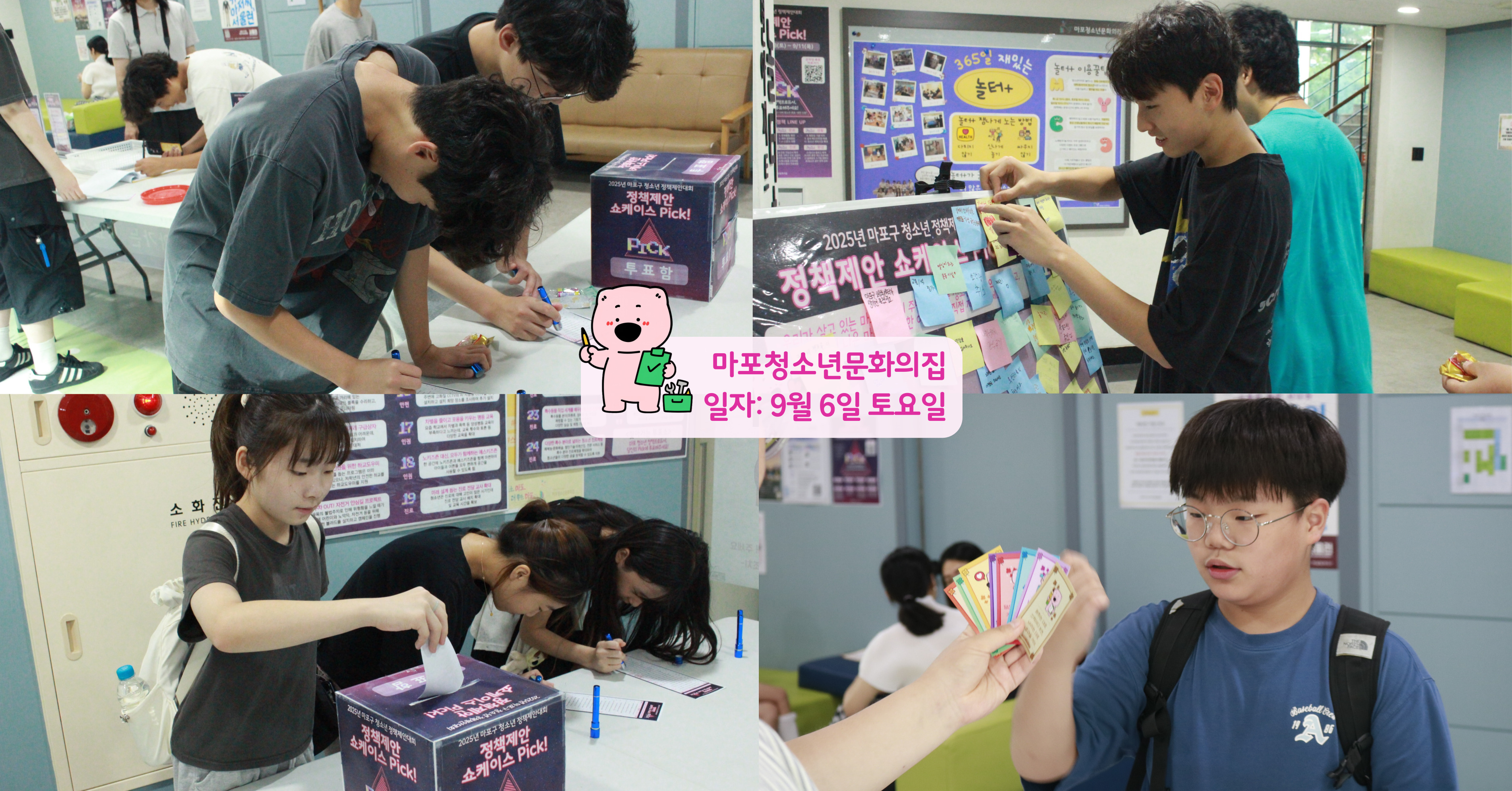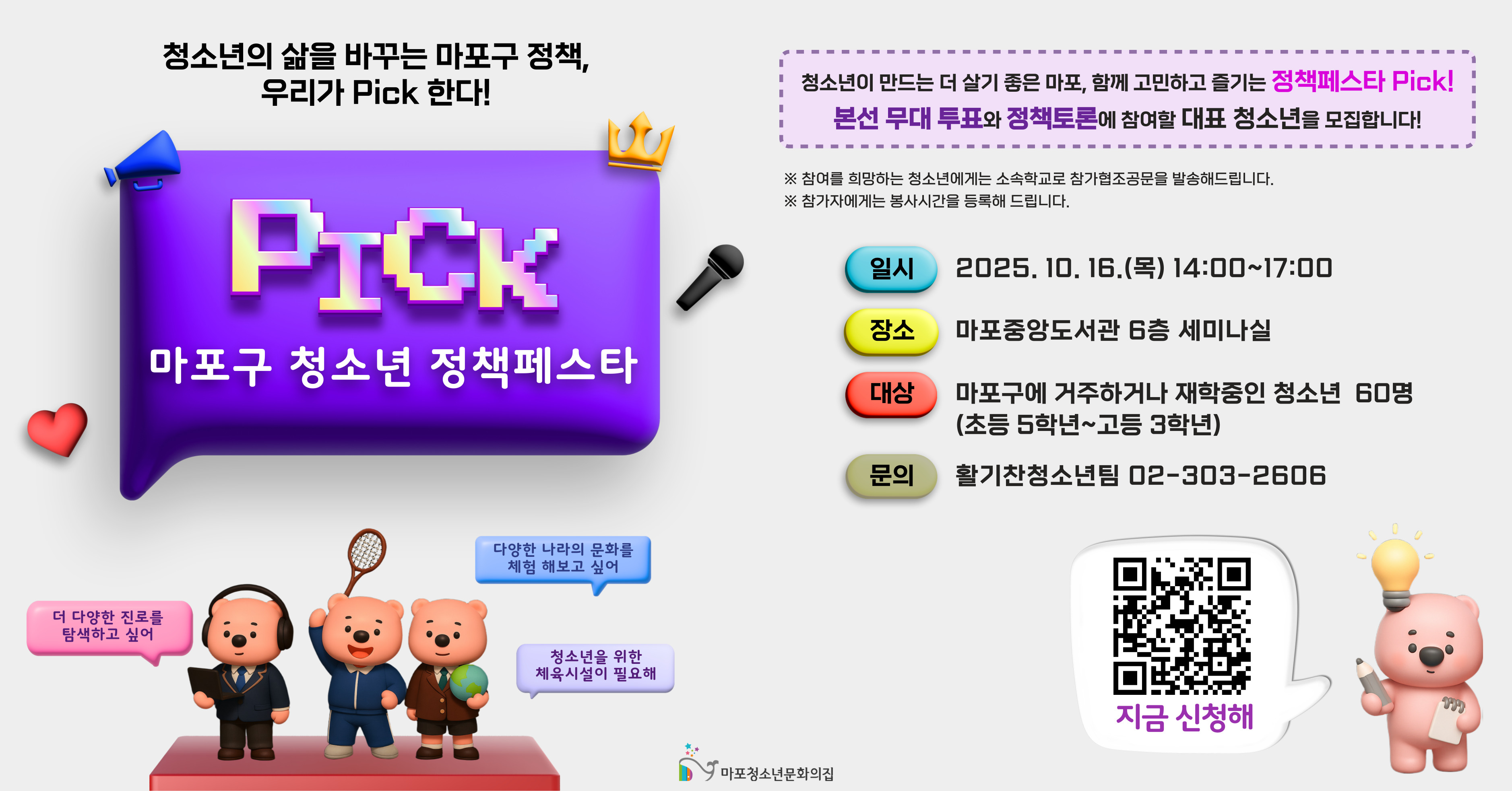 📌¸¶Æ÷±¸ û¼Ò³â Á¤Ã¥Æä½ºÅ¸ Pick! - ÀϽÃ: 2025³â 10¿ù 16ÀÏ (¸ñ) 14:00~17:00 - Àå¼Ò: ¸¶Æ÷Áß¾Óµµ¼°ü 6Ãþ ¼¼¹Ì³ª½Ç - ³»¿ë: ¸¶Æ÷±¸ Á¤Ã¥Á¦¾È¼îÄÉÀ̽º Pick! º»¼±¹«´ë, Á¤Ã¥Åä·Ð µî