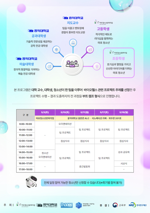 📌 ¿î¿µ¹æ½Ä ´ëÇб³¼ö, ´ëÇлý, û¼Ò³âÀÌ ÇÑ ÆÀÀ» ÀÌ·ç¾î ¹ÙÀÌ¿ÀÇコ °ü·Ã ÇÁ·ÎÁ§Æ® ÁÖÁ¦¸¦ ¼±Á¤ÇÑ ÈÄ ÇÁ·ÎÁ§Æ® ¼öÇà~°á°ú µµÃâ±îÁöÀÇ Àü °úÁ¤À» ºÎƮķÇÁ Çü½ÄÀ¸·Î ÁøÇà 📌 ¿î¿µÀÏÁ¤ 2025³â 5¿ù 3ÀÏ(Åä), 10ÀÏ(Åä), 11ÀÏ(ÀÏ), 17ÀÏ(Åä), 18ÀÏ(ÀÏ) / ÃÑ 5ȸ ¡Ø ÀÚ¼¼ÇÑ È°µ¿ ³»¿ëÀº ¸ÞÀÎ Æ÷½ºÅÍ Âü°í ¡Ø Àüü ÀÏÁ¤ Âü¿© °¡´ÉÇÑ Ã»¼Ò³â¸¸ ½Åû(ȸ±âº° Âü¿© ºÒ°¡)