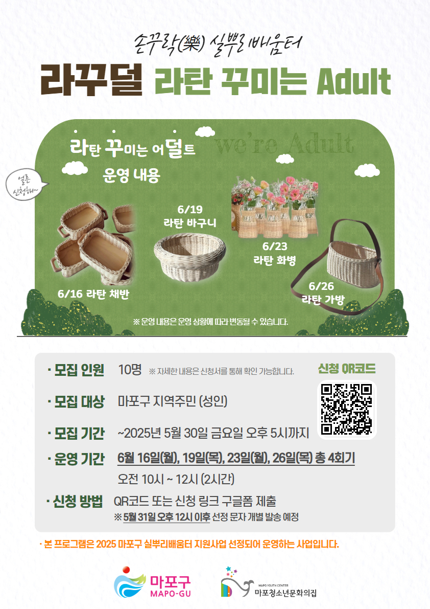 ✅ÀϽà : 6/16(¿ù), 6/19(¸ñ), 23(¿ù), 26(¸ñ) ÃÑ 4ȸ±â 10:00~12:00 ✅´ë»ó : ¸¶Æ÷±¸ °ÅÁÖ ¼ºÀÎ(Áö¿ªÁÖ¹Î) 10¸í ✅Àå¼Ò : ¸¶Æ÷û¼Ò³â¹®ÈÀÇÁý ³» ÇÁ·Î±×·¥½Ç ✅³»¿ë : ¶óźÀ¸·Î ¿©¸§³ª±â(ä¹Ý, ¹Ù±¸´Ï, Ⱥ´, °¡¹æ) ✅Âü°¡ºñ /Àç·áºñ: ¹«·á 📌±â°ü ¹× °»ç »óȲ¿¡ µû¶ó ¿î¿µ ³»¿ëÀº º¯µ¿µÉ ¼ö ÀÖ½À´Ï´Ù.