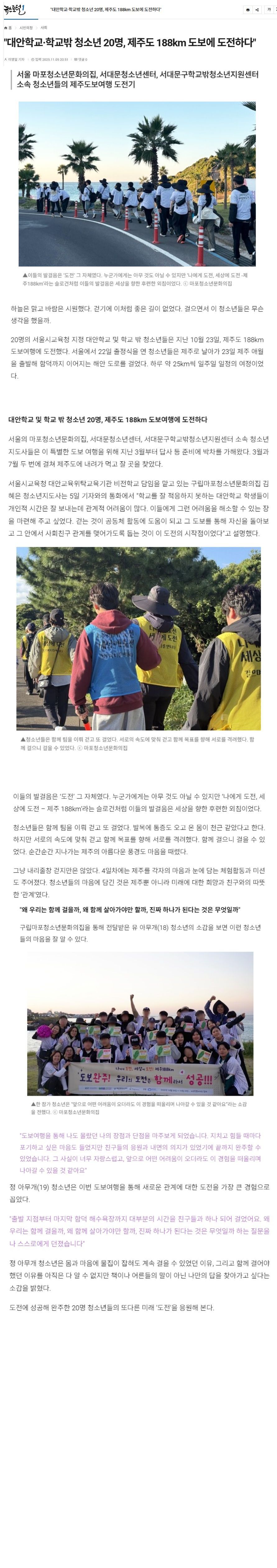 | [¼Ò½Ä] ´ë¾ÈÇб³¡¤Çб³¹Û û¼Ò³â 20¸í, Á¦ÁÖµµ 188km µµº¸¿¡ µµÀüÇÏ´Ù(2025.11.05.) | ||