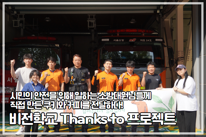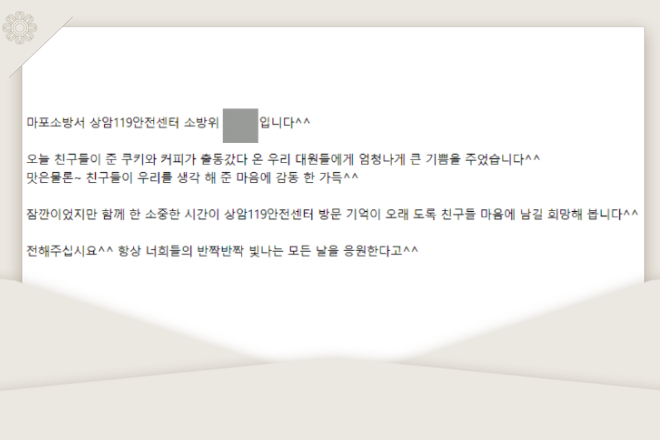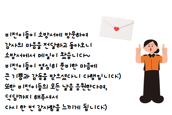 ¾ÈÀüÀ» À§ÇØ ³ë·ÂÇØÁֽô 119 ¾ÈÀü¼¾ÅÍ¿¡ °¨»çÀÇ ¸¶À½À» ´ã¾Æ Á÷Á¢ ¸¸µç Ä¿ÇÇ¿Í Äí۸¦ °¡Áö°í ¹æ¹®Çß¾î¿ä! ÀÌ Ä¿ÇÇ¿Í ÄíŰ´Â ºñÀüÇб³ÀÇ ¹Ù¸®½ºÅ¸¿Í Á¦°úÁ¦»§ ½Ã°£¿¡ ¹è¿î °ÍÀ» Ȱ¿ëÇØ ¸¸µç °ÍÀ̶ø´Ï´Ù! ºñÀüÀ̵éÀº ¼³·¹ÀÓ°ú ¶³¸²À» ¾È°í 119 ¾ÈÀü¼¾ÅÍ¿¡ ¹æ¹®Çߴµ¥¿ä! ¼Ò¹æ´ë¿ø ºÐµéÀÌ ¹Ý°©°Ô ȯ¿µÇØÁּż ºñÀüÀ̵鵵 ±äÀåÀ» Ç®°í °¢ÀÚ ¿½ÉÈ÷ ¿¬½ÀÇϰí ÁغñÇÑ ¸àÆ®·Î Àλç¿Í ÁغñÇÑ °ÍÀ» µå¸± ¼ö ÀÖ¾ú½À´Ï´Ù!