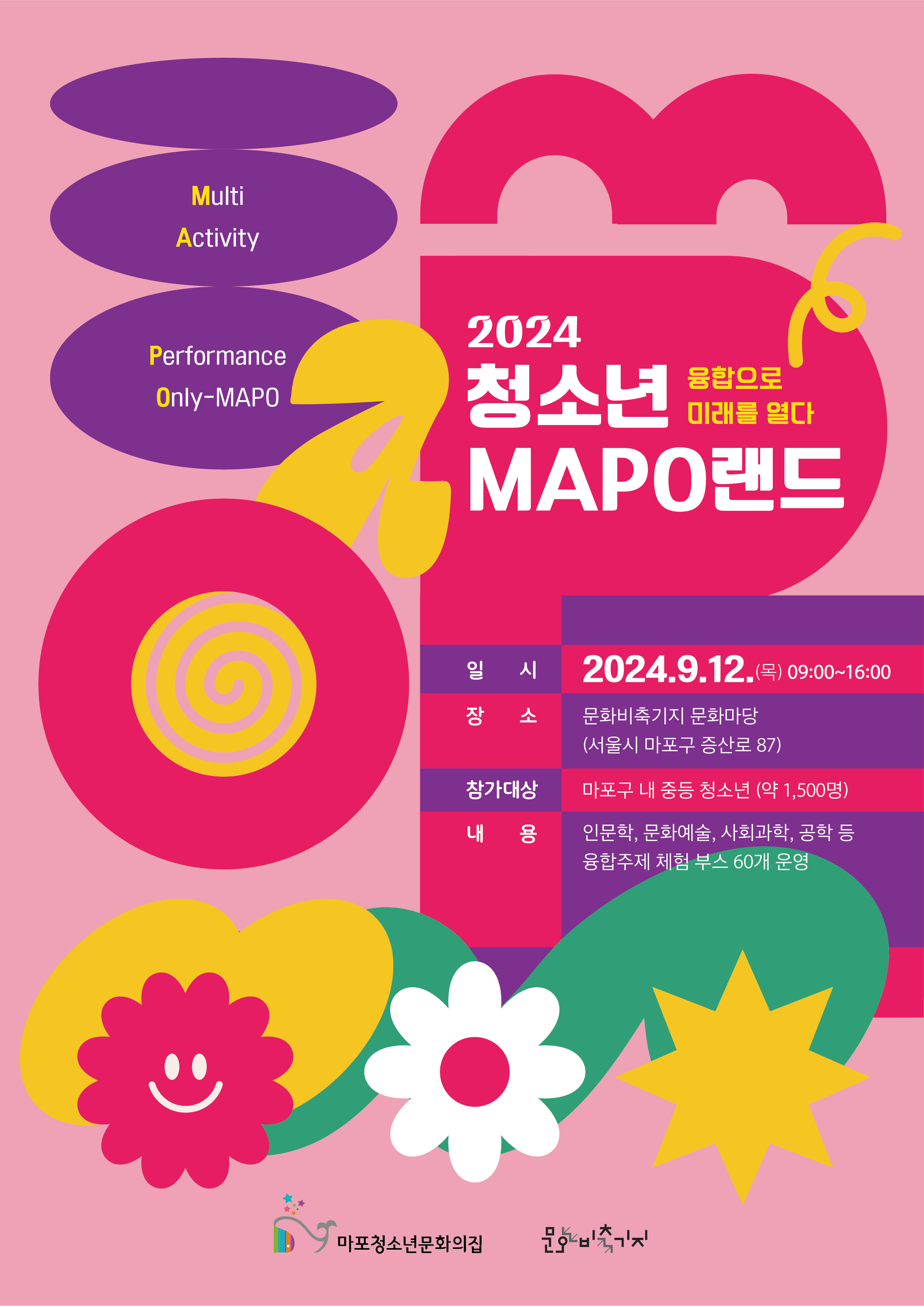 2. ¿î¿µÆ¯Â¡: °¡. ¡®Àι®, ¿¹¼ú, »çȸ°úÇÐ, °øÇС¯ µîÀÇ À¶ÇÕÀ» ÁÖÁ¦·Î ÇÑ ¸¶Æ÷±¸ ù ¹øÂ° û¼Ò³â À¶ÇÕÃàÁ¦ ³ª. ºÎ½ºÃ¼Çè Áß½ÉÀÇ ¹Ú¶÷ȸ°¡ ¾Æ´Ñ, û¼Ò³âµéÀÌ Á÷Á¢ °æÇèÇϰí üÇèÇϸç Áñ±æ ¼ö ÀÖ´Â ¾×ƼºñƼÇü ÃàÁ¦ÀÇ Àå