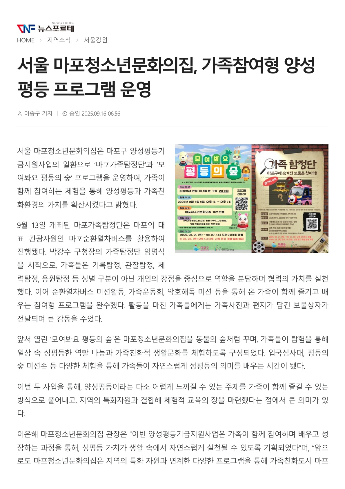 | [¼Ò½Ä] ¼¿ï ¸¶Æ÷û¼Ò³â¹®ÈÀÇÁý, °¡Á·Âü¿©Çü ¾ç¼ºÆòµî ÇÁ·Î±×·¥ ¿î¿µ(2025.09.16.) | ||