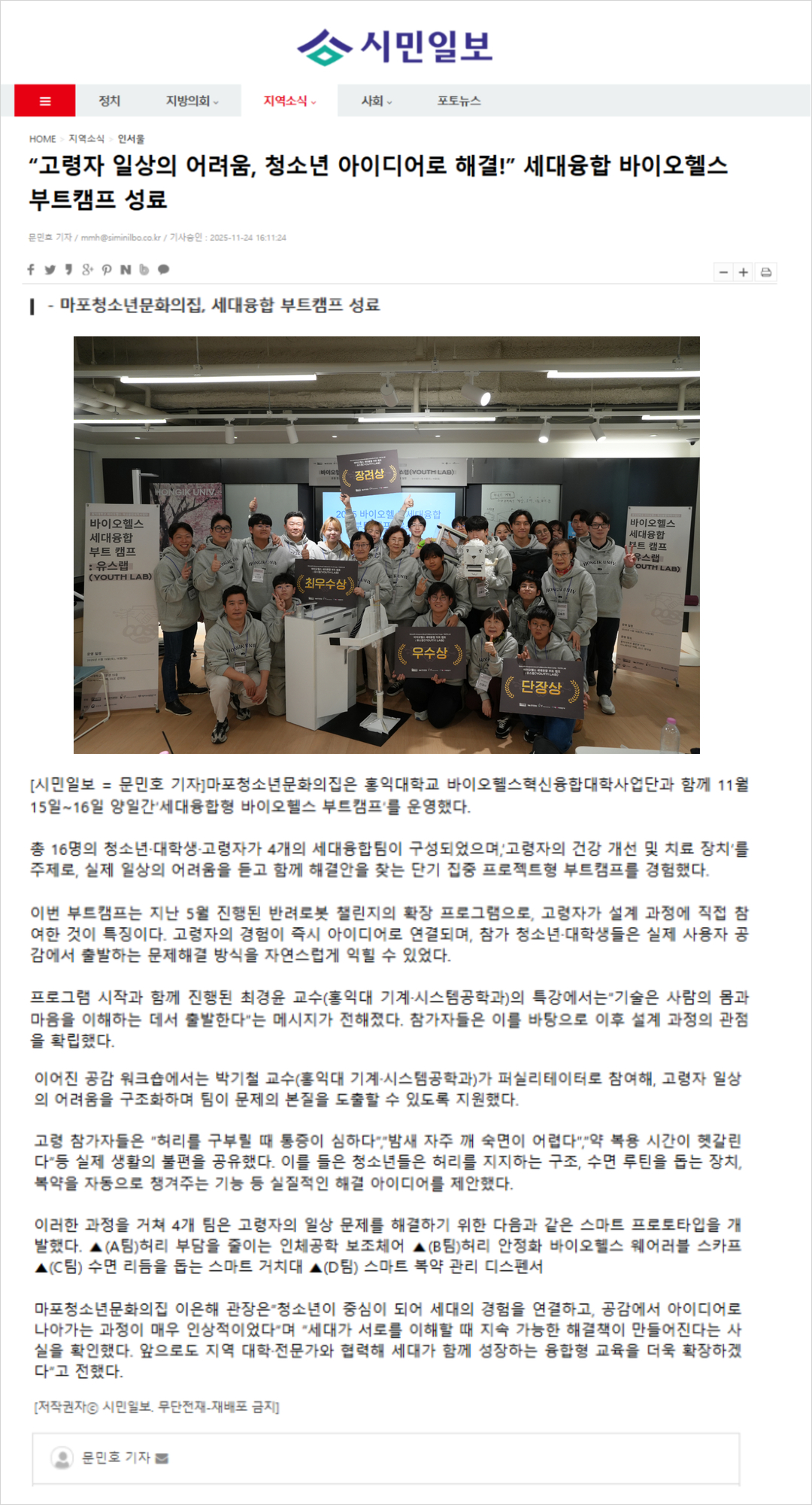 | [¼Ò½Ä] ¡°°í·ÉÀÚ ÀÏ»óÀÇ ¾î·Á¿ò, û¼Ò³â ¾ÆÀ̵ð¾î·Î ÇØ°á!¡± ¼¼´ëÀ¶ÇÕ ¹ÙÀÌ¿ÀÇコ ºÎƮķÇÁ ¼º·á(2025.11.24.) | |