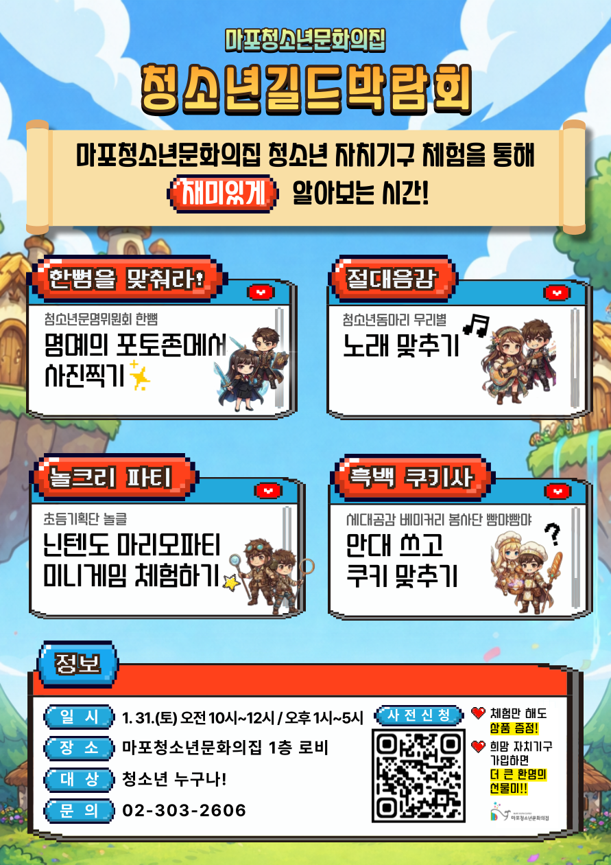 📅 2026. 1. 31.(Åä) ⏰ 10:00~12:00 / 13:00~17:00 📍 ¸¶Æ÷û¼Ò³â¹®ÈÀÇÁý 1Ãþ ·Îºñ 🎯 ´ë»ó : û¼Ò³â ´©±¸³ª 🎯 »çÀü½Åû½Ã, ¼±Âø¼ø100¸í ±Í¿©¿î Èü»ö°¡¹æÁõÁ¤!! [»çÀü½Åû] https://form.naver.com/response/2Oh3a3eQC0f3fVj7qZ9yFA