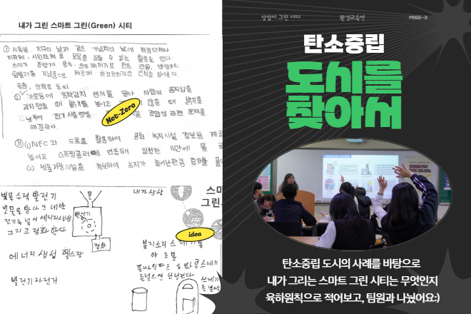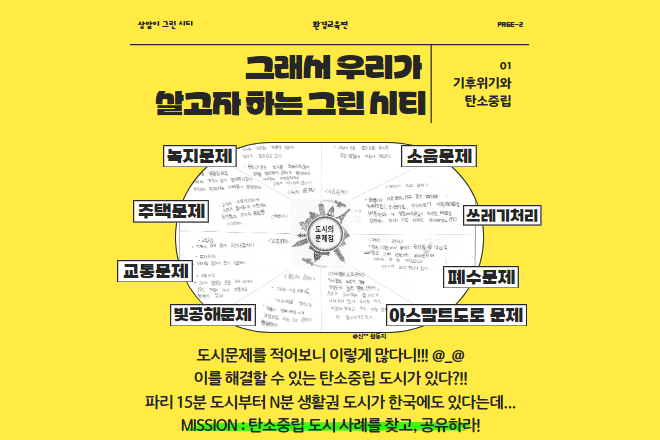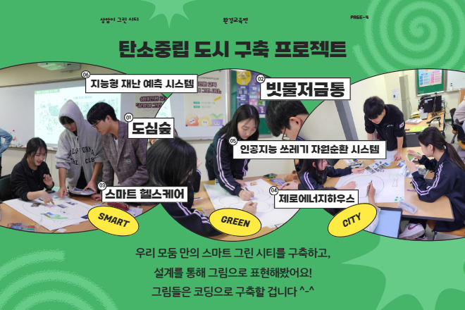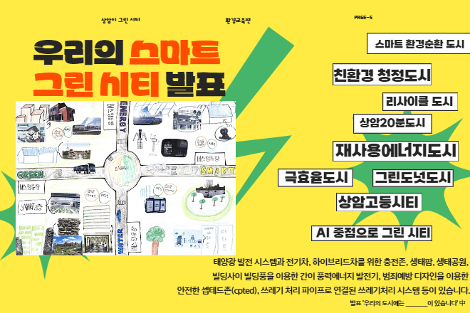 Áö³ 3¿ùºÎÅÍ 4¿ù ÇÑ´Þ °£ »ó¾Ï°í 1Çгâ 6~10¹Ý û¼Ò³âµé°ú ±âÈÄÀ§±â¸¦ ´ëÀÀÇϱâ À§ÇØ Áö¼Ó°¡´ÉÇÑ ½º¸¶Æ® ±×¸° µµ½Ã(Smart Green City)¸¦ °í¹ÎÇØº¸°í µðÀÚÀÎÇϴ Ȱµ¿À» Çß¾î¿ä:)
